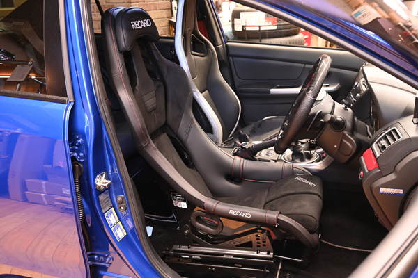神奈川県からご来店です。 純正レカロシートだと骨盤が滑り長時間運転がしにくいとのことで、フルバケットシートRSSの中から赤ステッチを組み合わせたASM LIMITEDを装着しました。 純正比約15mmダウンのポジションにセッティングしています。