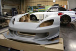 | 大きなポイントは3点あってまずは大型リヤウィングです。ドラッグを最小限に抑えつつしっかりとダウンフォースを生み出すウィング断面形状は、実は2004-2005で使用したI.S.Designリヤウィングを大型化したものに酷似しており、市販製品を基にレギュレーションのないチューニングパーツとして特化したものとも言えます。ウィングの効果を全てトラクションに変えるため、カーボンで製作したステーBOXをボディに直接固定しました。リヤウィングが生み出すダウンフォースを基本としてフロントセクションの形状を決定しました。前床がバンパー前側にせり出して、その上にフロントバンパーを固定すると言うチューニングカーとしてはほとんど見ない手法で固定しました。床をガッチリと固定することで床が生み出すダウンフォースを逃がさずボディを押さえる力に変えつことができ、フロントリップ部分には人が乗れる強度・剛性を確保しました。これらはいずれもS-GTの世界では当たり前の手法であり、「チューニングカーにレーシングカーの正しい手法を取り込む」と言うASMコンセプトの一環として採用しています。ダウンフォースを向上するため、フロントバンパー開口部から取り込んだ空気をボンネットに追加されたダクトを通過して上方へ排出し、ダウンフォースを向上すると共に冷却効率も向上しました。サイドステップにはフロントフェンダーから排出された空気を床に巻き込まないように、後方へ導くフェンスを追加しています。 |