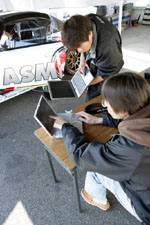 | 暑さが残る9月16日にASM筑波スペシャル2006をシェイクダウンしました。今年で最後のF1開催となるホンダの聖地と言える鈴鹿サーキットにASM筑波スペシャルを持ち込みました。2年前、たった1度だけこのサーキットでASM筑波スペシャルを走らせたことがあります。羽根選手からはボディ性能の低さを酷評され、オイルタンク問題で全く走行できずエンジン始動確認程度にしかなりませんでした。あれから2年、ピーキーで繊細だったASM筑波スペシャルは2年の間に徐々に強さを身につけました。リヤウィングの角度変更、バネレート変更、減衰調整等セットアップを繰り返して最終セッションでアタック開始。春先に下ろしたUSEDタイヤを使用して、2分18秒8と言うNAチューニングカーコースレコードを記録しました。仕様変更、再度コースインして更なるタイムアップを狙って走行開始しましたが、車が帰って来ません。嫌な予感がスタッフの脳裏をかすめながら食い入るようにモニターを覗きこんでいると、130R手前で走行停止したASM筑波スペシャルが映し出されました。コースレコード樹立とトラブルによるマシン停止、思えば今シーズンのタイムアタックを象徴する出来事がシェイクダウンに凝縮されていた気がします。停止した原因は電気系のトラブルで、エンジンには問題ありませんでした。 |