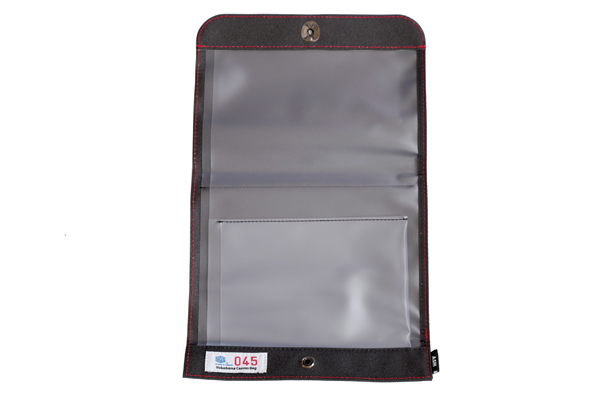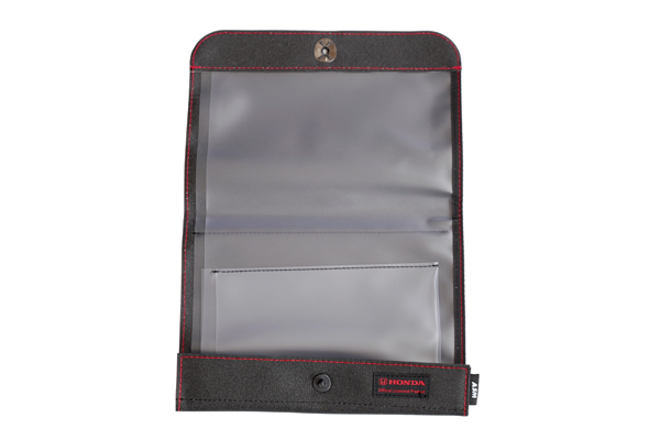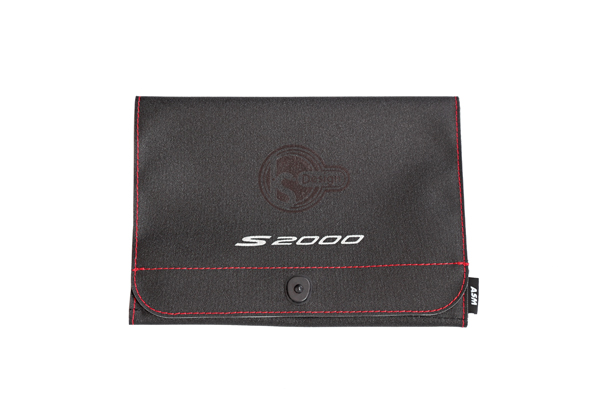 横濱帆布鞄に製作依頼した車検証入れ。新規格A6サイズ電子車検証対応ホルダー付。ダイワボウ黒帆布ファイナルで製作した本体表面に同色黒I.S.DesignマークとS2000ロゴを押印し、Honda OLPマーク・横濱帆布鞄・ASMの織ネームを追加して、エースクラウン社赤5番糸で縫製しました。 |
