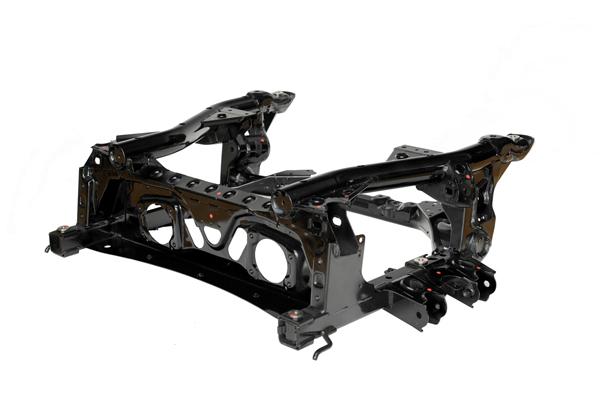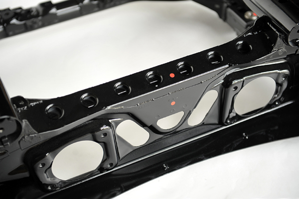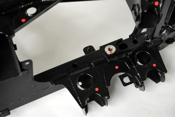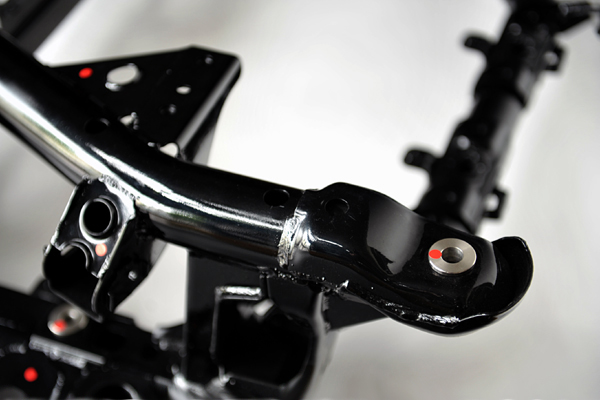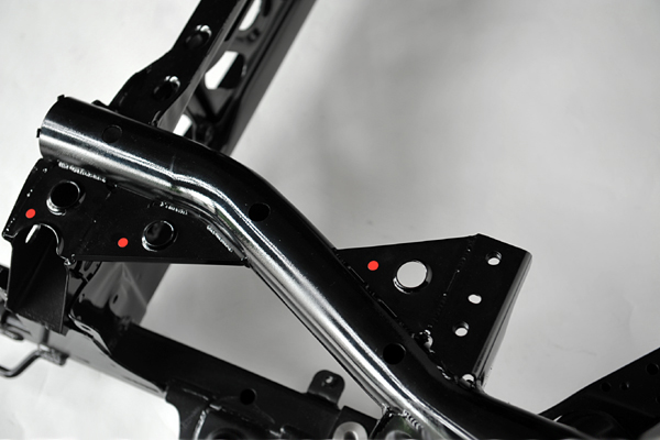 開口部分にガセットプレートを追加した他、サスペンションアーム取付部分BOX化+取付点補強とサブフレームのセンター出しをするためのステンレス製スペーサーをセットしたサブフレーム。AP1-100〜120に装着する場合、アッパーアームを変更する必要があります。写真で赤●シール部分が新規追加部分です。