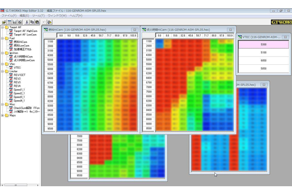 VTEC切り替え回転数、<高負荷>設定:5,300rpm/復帰:5,100rpm <低負荷>設定:6,050rpm/復帰:5,850rpm、REVリミット9,300rpm、速度リミッター変更済み。参考出力240.2PS 20.9kgm 22℃ 953hPa。ASMとG.T WORKSの実走セッティングにより、VTEC切り替えポイント近辺で発生しているノッキングを軽減し、最高出力とエンジン保護性能をバランスしました。ASMは、純正ECUと同じ沖電気製フラッシュタイプMPUを採用しています。MOTEC等社外フルコン並みに解析が進んでおり、様々な仕様にリセッティング可能です。 |