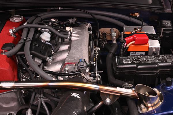 リチウムバッテリーsuper B 15P-ECと組み合わせて装着するオイルキャッチタンク。タンク本体重量820g(ホース類除く)。 |