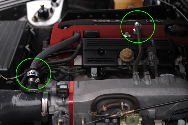 エンジン内圧が及ぼすフリクションに注目して製作した、静音化・メンテナンスと取付を簡略化した内圧コントロールバルブ。安定した負圧を発生させる専用PCVバルブを組み合わせました。